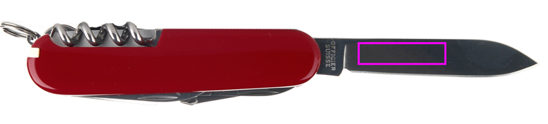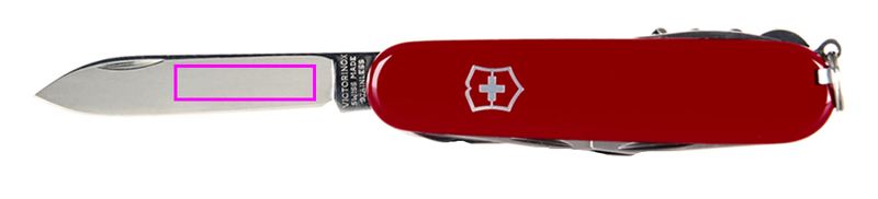 egenskaper: 1. stort blad 2. nagelfil spik: 3 - en anordning för rengöring av naglarna 4. korkskruv 5. burköppnare med: 6. - liten skruvmejsel 7. öppnarlock med: 8. - skruvmejsel 9. - wire stripper 10 . spett-syl 11. nyckelringen 12. pincett 13. tandpetare