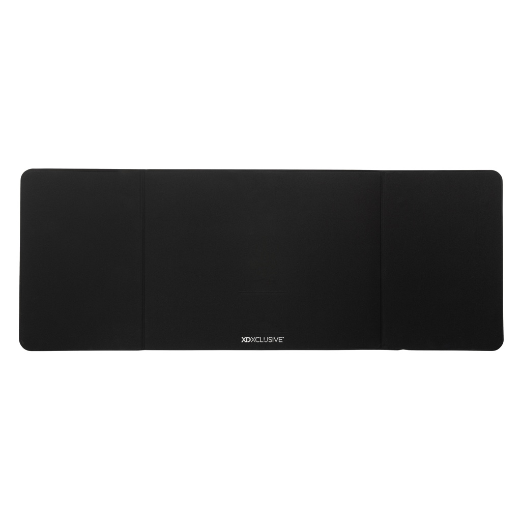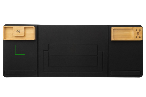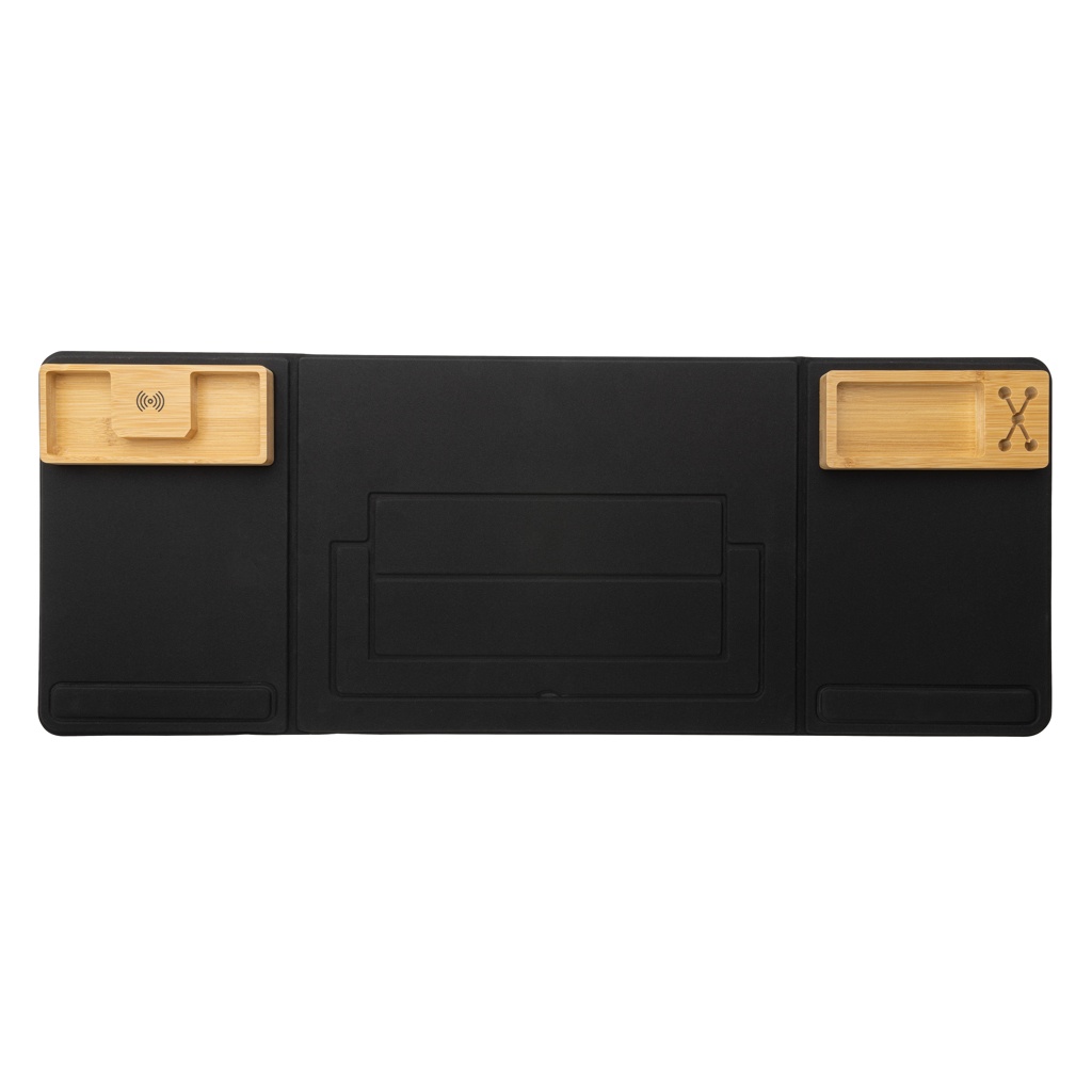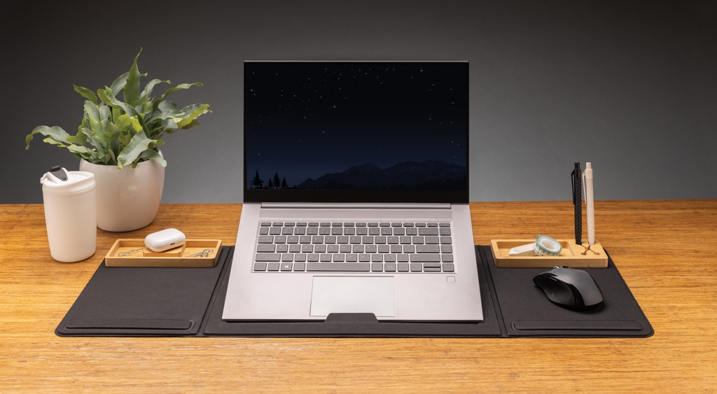 Se till att var sak har sin plats på ditt skrivbord med denna A5 AWARE™ RPET hopvikbara skrivbordsorganisatör. På insidan finner du en bambu 10W trådlös laddare med pennhållare och ett enkelt tredelat laptopställ (max 17"). Pennhållaren och den trådlösa laddaren hålls på plats med hjälp av magneter. Insida och utsida i 100% återvunnen RPET med AWARE™ spårämne. 120cm micro USB kabel i RCS återvunnen TPE medföljer. Med AWARE™ spårämne som bevisar användandet av återvunna material. Denna produkt har sparat 6.6 liter vatten och återanvänt 11 plastflaskor. 2% av intäkterna för varje såld Impact-produkt kommer att doneras till Water.org. PVC-fri.