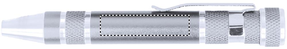 Verktygsset med utdragbar aluminium ficklampa med 3 LED-ljus och aluminium multiverktyg . Inkluderar 4 spår och 4 skruvmejsel huvuden. 4 batterier LR44 ingår. Presenteras i en box.
