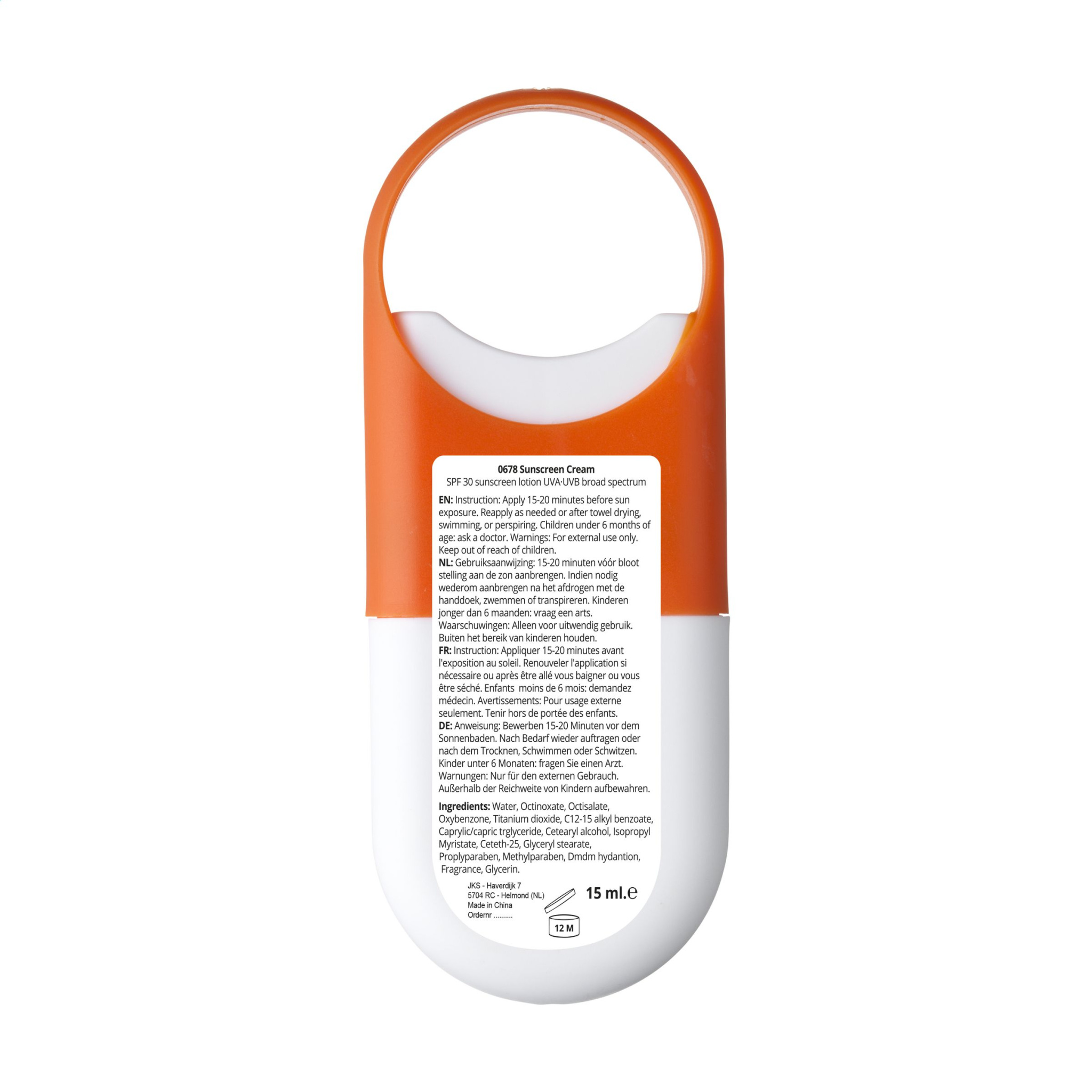 Skyddande solskyddslotion (faktor 30) i en praktisk plastspraysticka med förångare och stort hängande öga. Bäst före: 12 månader efter öppning. Innehåll 15 ml. Ingredienser: aqua, oktinoxat, oktisalat, oxybenzon, titandioxid, C12-15 alkylbensoat, kapryl/kaprintriglycerid, Cetearylalkohol, isopropylmyristat, Ceteth-25, glycerylstearat, propylparaben, metylparaben, glycerolhydrat, glycerol.