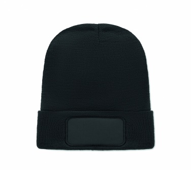 Unisexstickad mössa i mjuk stretchig RPET-polyester med mudd och lapp.